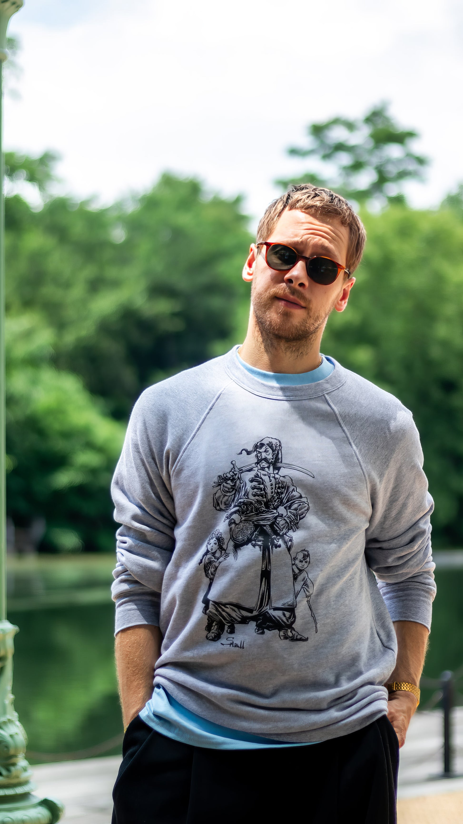 Model Oleh, on the first picture, is 187 cm/73.6 in and is wearing XL with dropped shoulders. Model Mykola is wearing M with raglan sleeves.